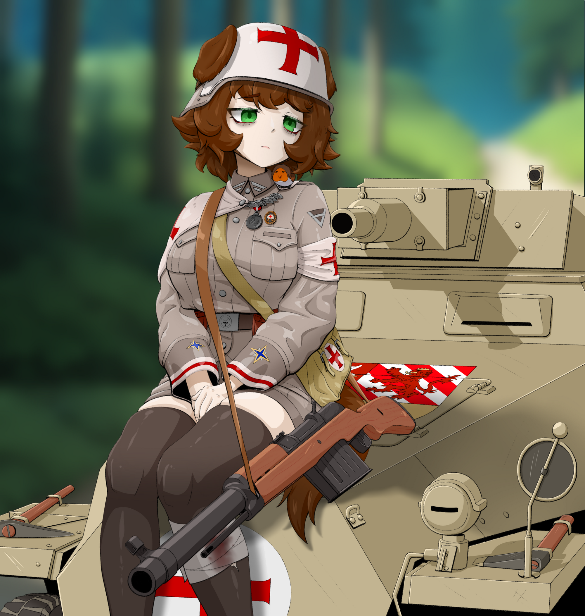 In the same moment shell hit her on the right arm, injuring her. The smoke engulfed her for a moment. „Ah, right!” –yelled and turned. She started running towards the forest where the shot came from. She got hit in her advance. Right arm again. Her grasp on her cannon loosened, having to switch to her less accurate left hand. Another shot came from the forest, but from a different direction. „Is it another one or the same?” –she thought for herself while dodge rolling. She got to the edge of the forest but she go hit in the left leg. But now she saw the exact location of the fire. Taking aim she sent a high-explosive shell right at it. She only heard a yell, in a familiar voice. Advancing to the impact place, she found a bit burned culprit lying on the ground. "Anna, milyy! I had a gut feeling it was you!" -she said laughingly while getting down next to her. She coughed. "Almost got you this time." -she turned her head to Misha, one eye shut. "Yeah, you did a number on me, barely able to move my right arm." -she said smirkingly. Anna gave a short smile and then "I hope it doesn't hurt much." -she said with a worrying tone and face. "Hah. Don't worry about me, you just took a 152 HE shell directly!" -Anna let out a laugh. Her armament disintegrated. "You did great milyy. Next time you might get me!" -she grinned. Anna's expression turned confident. "I will, - be alert of every bush." -she said with a smug-ish face. She put her hand on her earpiece. "Command, StuH 42 G out!" Spreading out on the ground. "Meet at Burg o' Phast?" -asked Misha. While disappearing: "Yeah." looking at her with a smile.